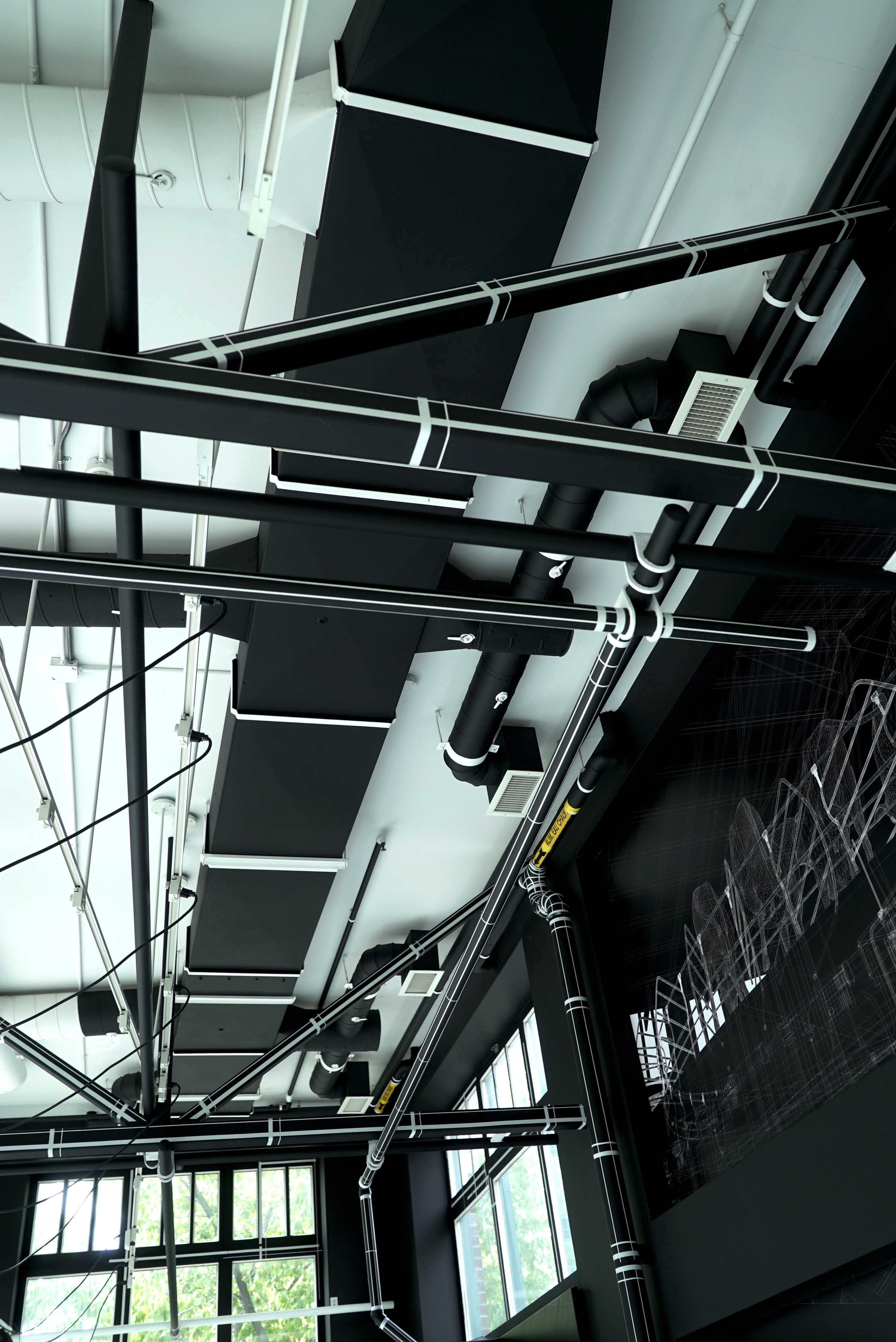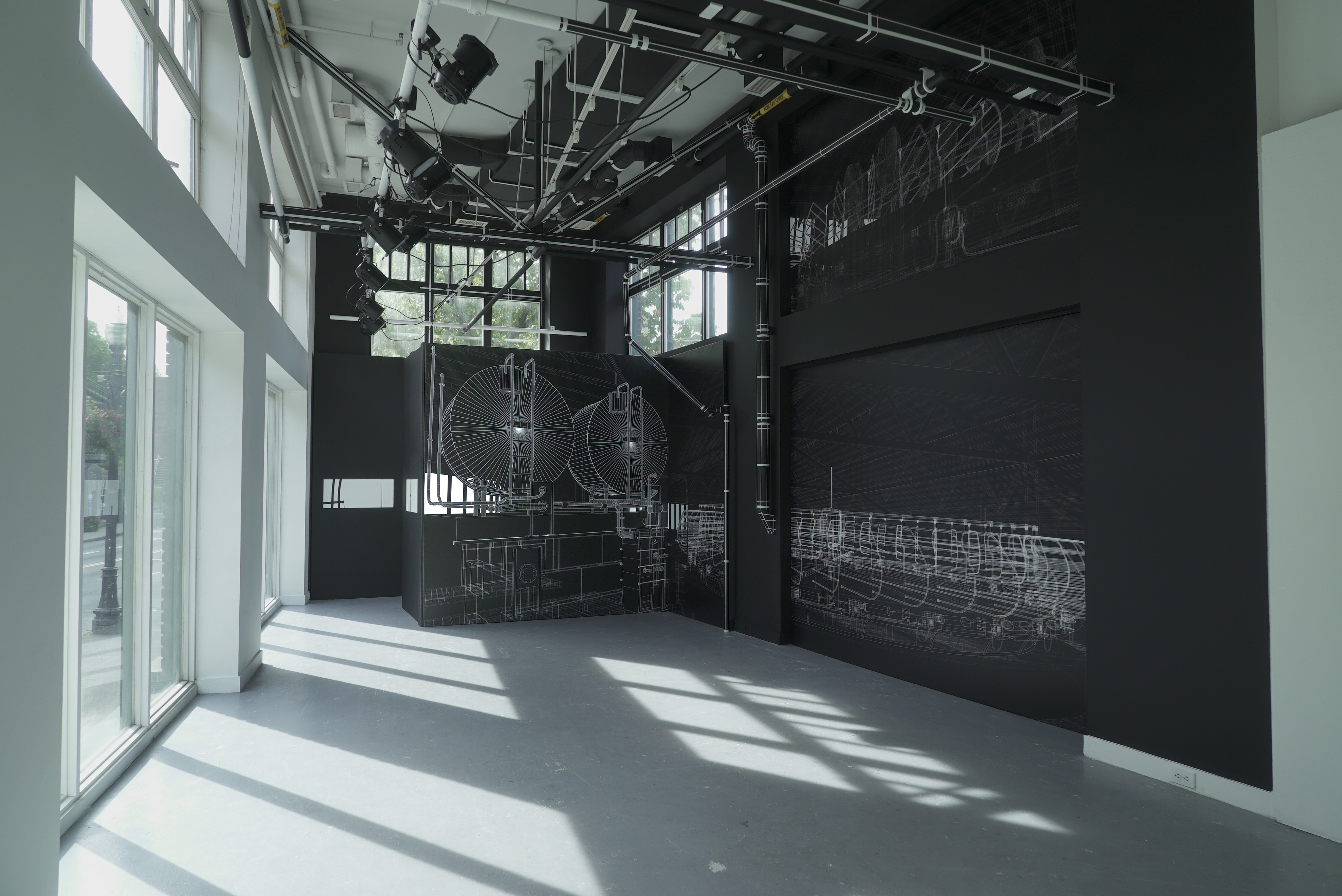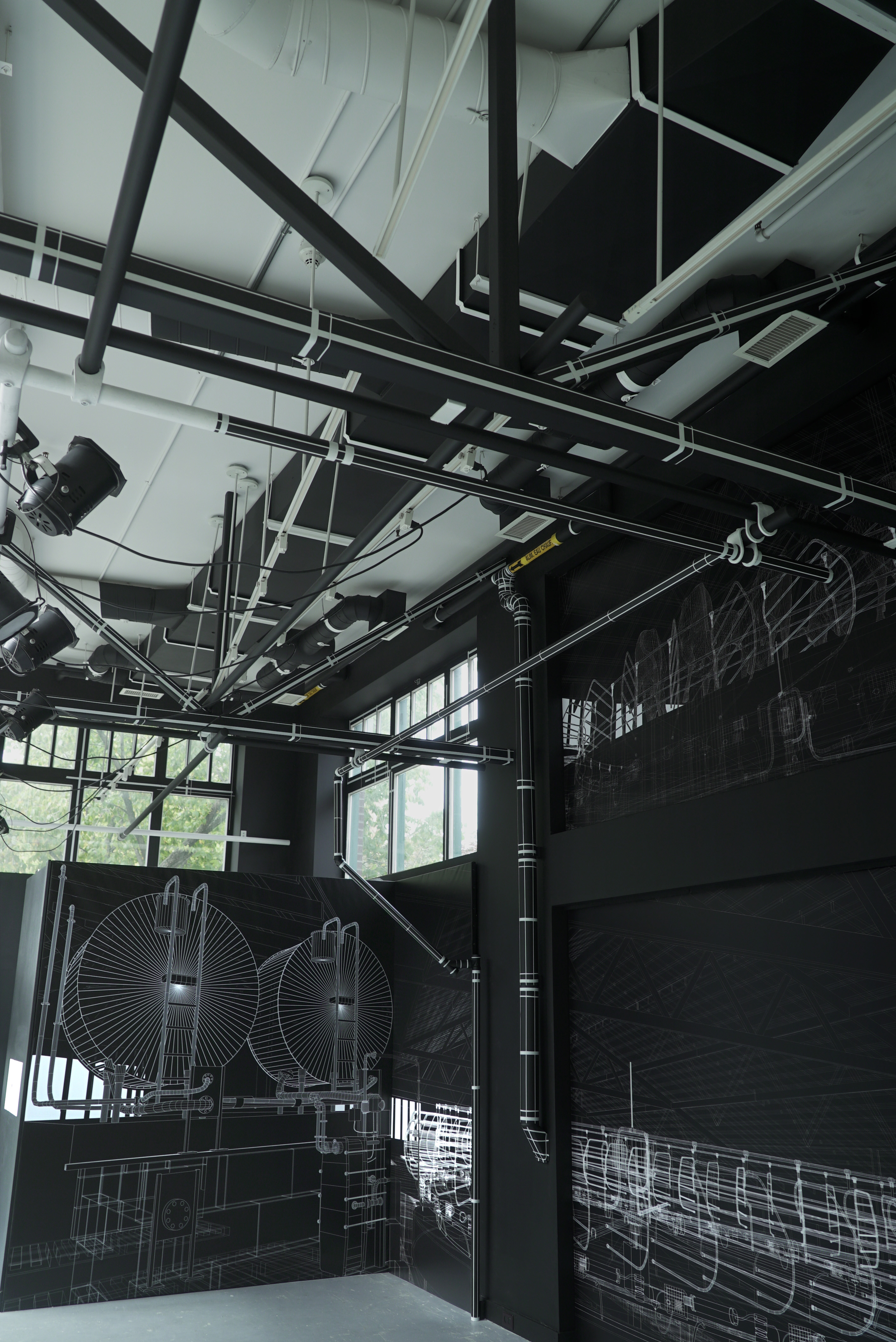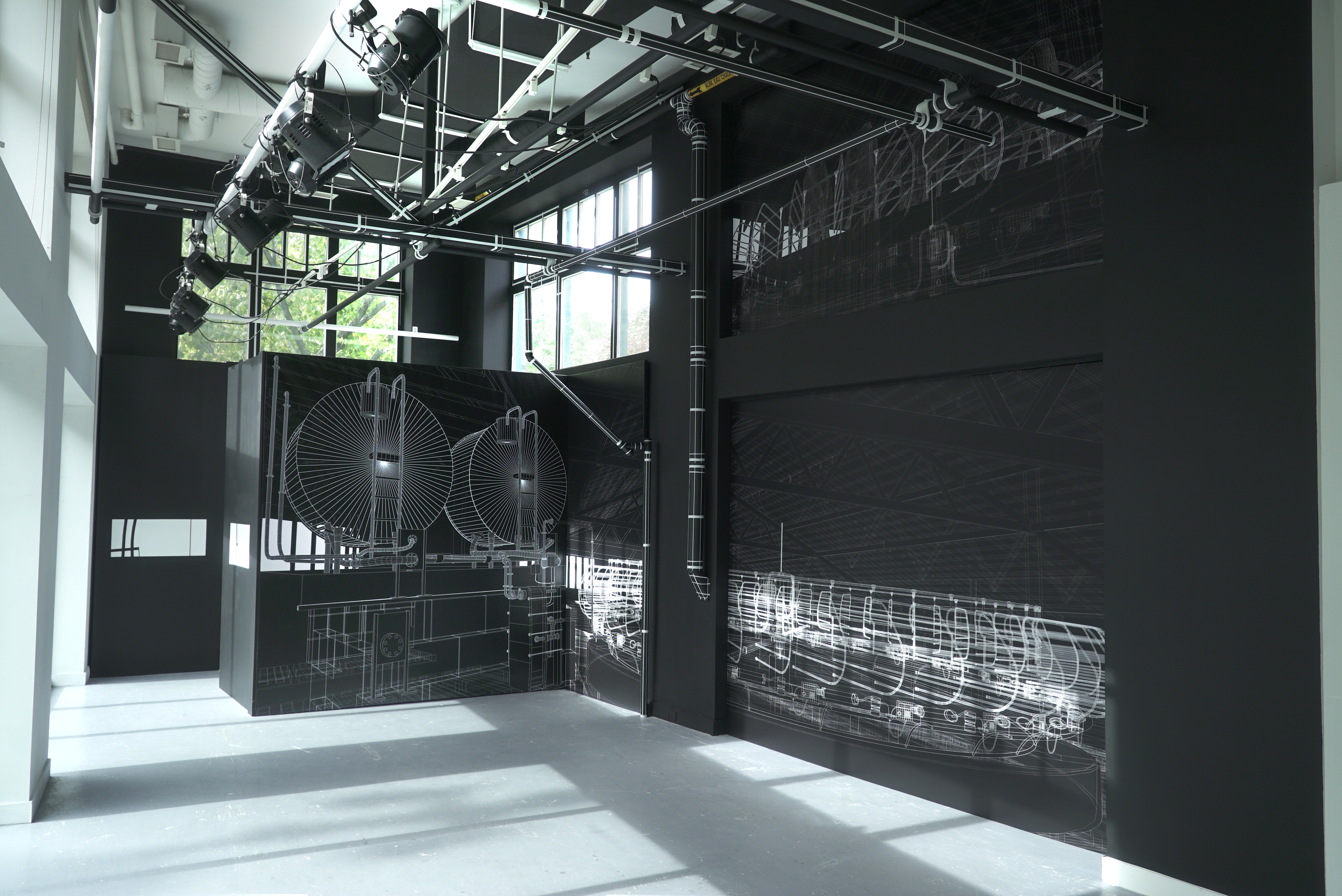 Il invite plutôt le visiteur à revisiter un espace qui lui est familier par sa transposition graphique en bâtiment de ferme laitière industriel. Les murs, les fenêtres, la plomberie et tout l’appareil technique de la salle d’exposition font l’objet d’un traitement graphique de lignes et de couleurs destiné à prolonger le dessin dans l’espace physique.
