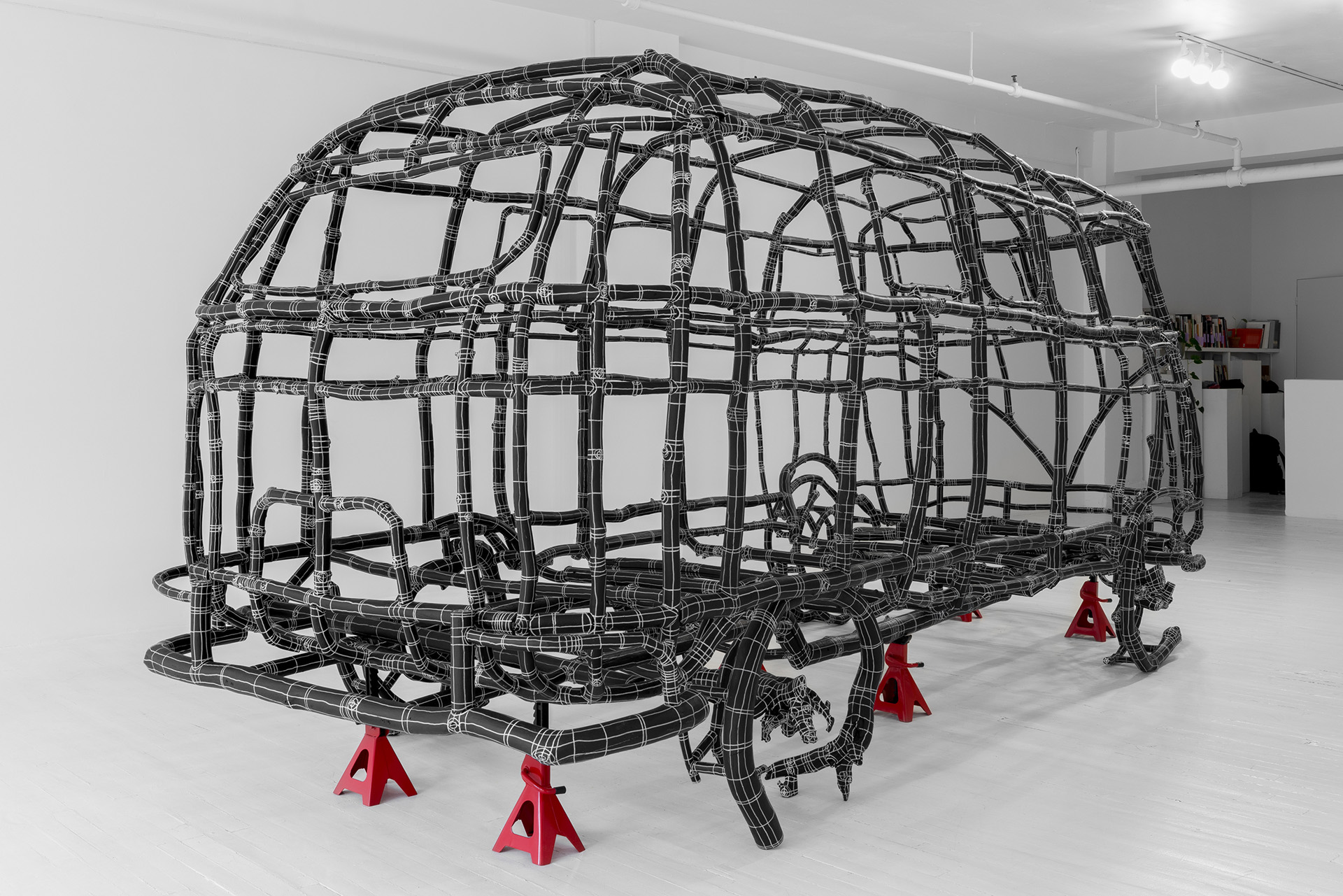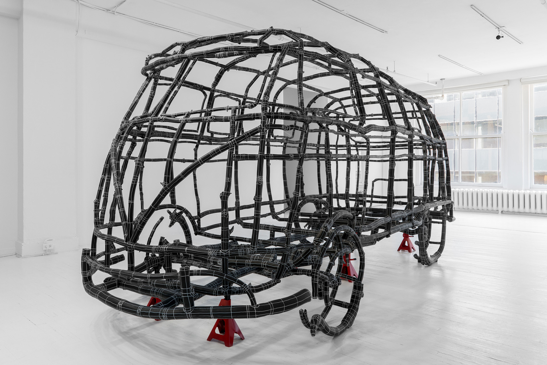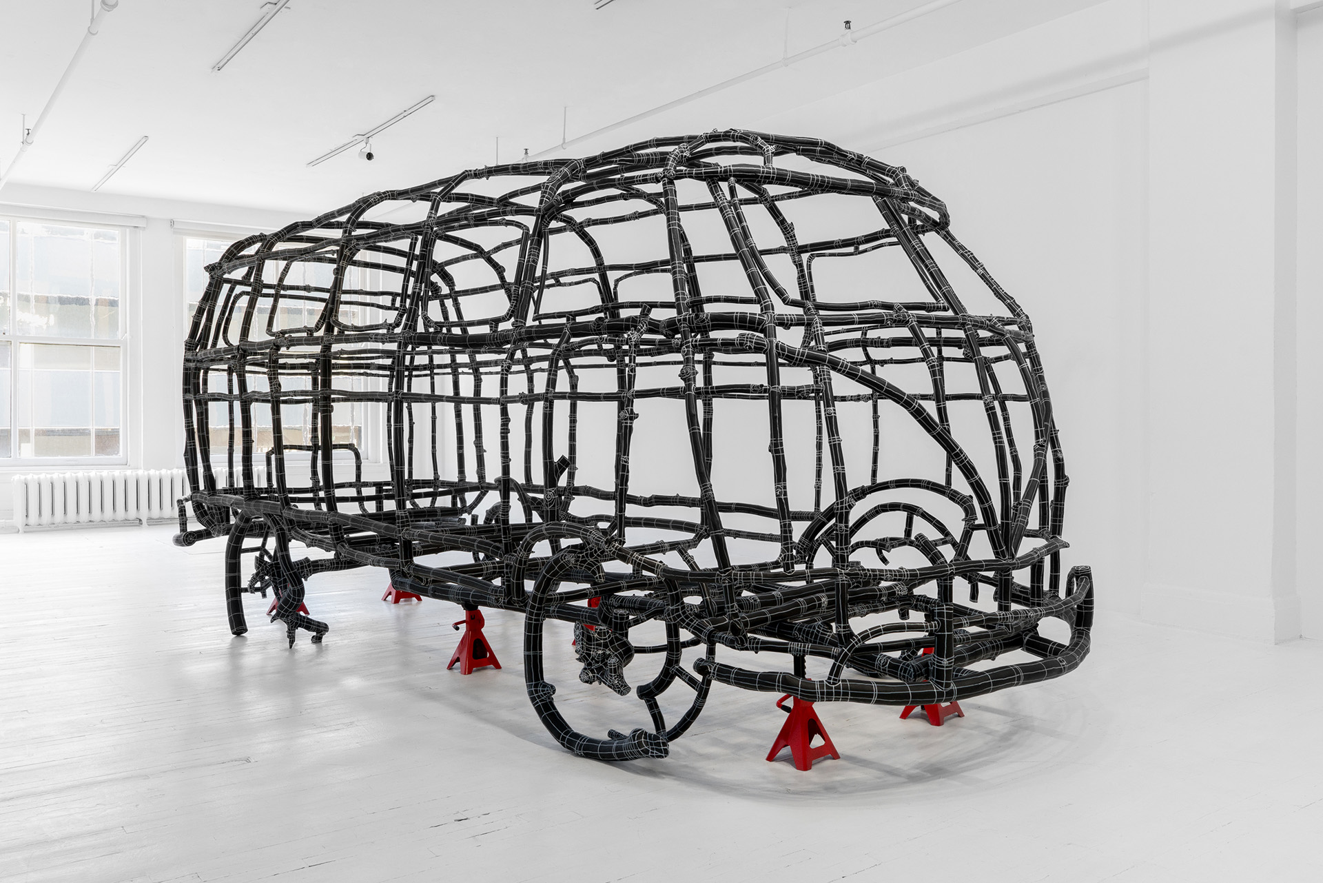 Cette sculpture monumentale construite depuis un assemblage de branches en bois flotté épouse la forme d’un campeur Westfalia modèle de 1967, à l’échelle 1:1. Ce véhicule, figure emblématique transgénérationnelle, occupe une place prépondérante dans l’imaginaire, renvoyant à une forme de tourisme ayant pris son essor durant la pandémie, amplifié par la crise climatique. Le Westfalia est aussi porteur d’un antagonisme, celui d’un mode de voyage romantique ramenant au nomadisme des années hippies, mais que l’on pourrait aujourd’hui qualifier de mode « élite », inaccessible à la plupart des citoyens. Le campeur renvoie aussi à la réalité d’un nomadisme forcé par la crise du logement. Ici, la structure de bois flotté évoque l’actualisation par procuration d’un projet utopique réalisé à partir d’un matériau pauvre.