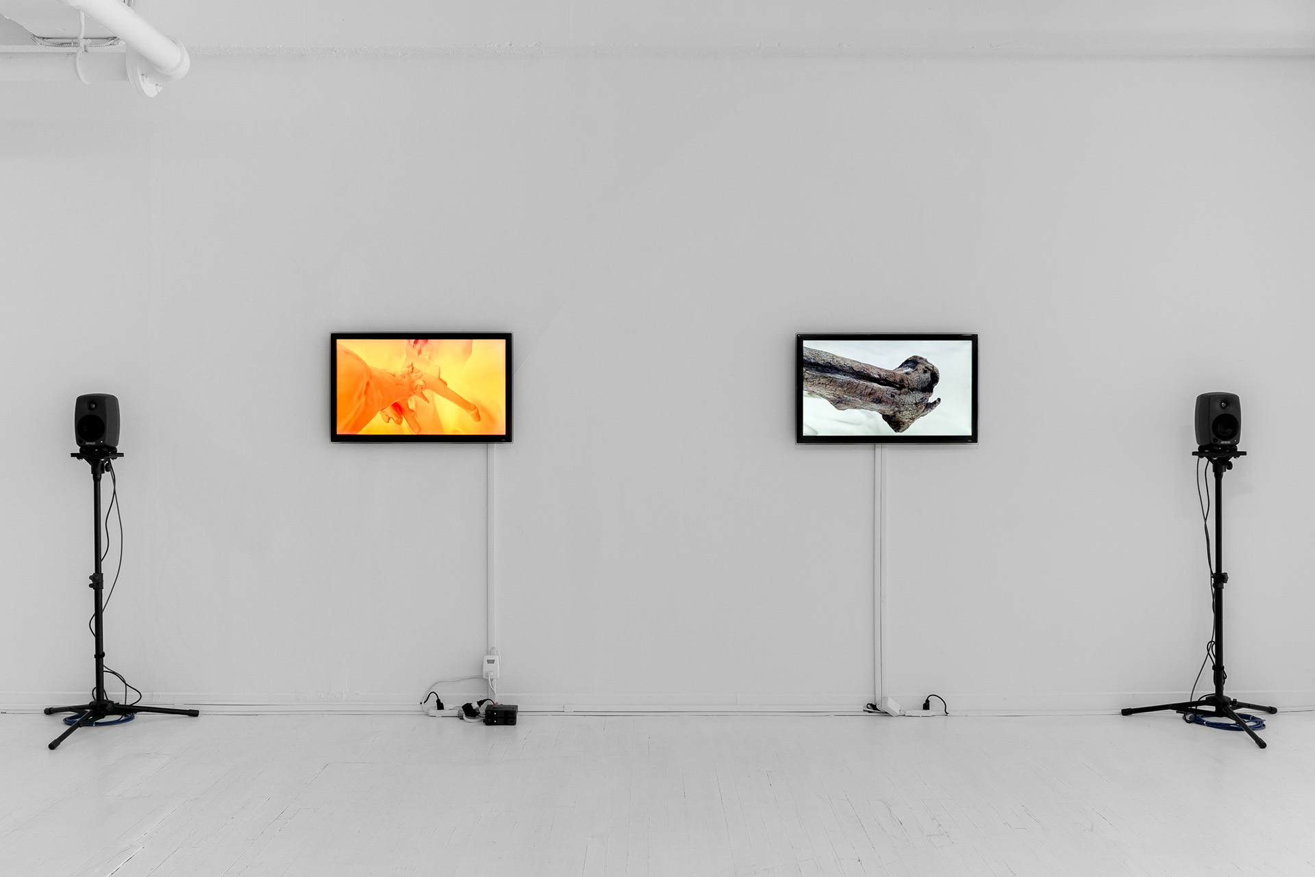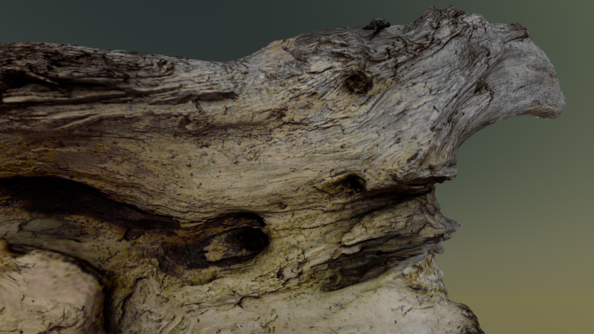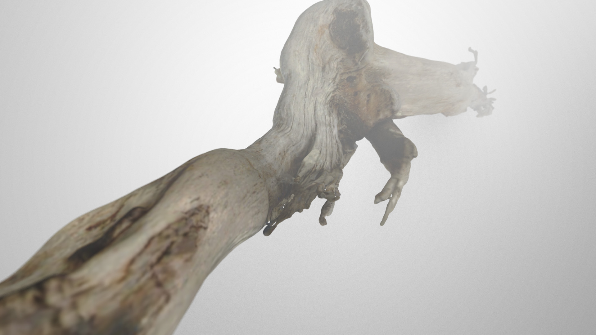 Paréidolies est réalisée au moyen de la photogrammétrie. Des branches de bois flotté récoltées sur la grèves du Saint-Laurent sont d’abord numérisées en 3D, puis filmées avant d’être subtilement animées dans de courtes vidéos où on se plait à dramatiser le phénomène psychologique de la paréidolie, soit la prédisposition de l’esprit humain à identifier des visages, des animaux ou autres figures familières que l’on croit percevoir dans les nuages, les rochers, ou en l’occurrence dans la morphologie du bois érodé et tordu. Un canal vidéo montre les branches filmées dans des coloris naturels, l’autre canal reprend les mêmes plans dans des couleurs totalement artificielles révélant d’autres aspects de la morphologie. Le tout dans un lent travelling laissant le visiteur suspendu à la découverte de nouvelles figures révélés par les angles changeants de notre point de vue sur ces objets.