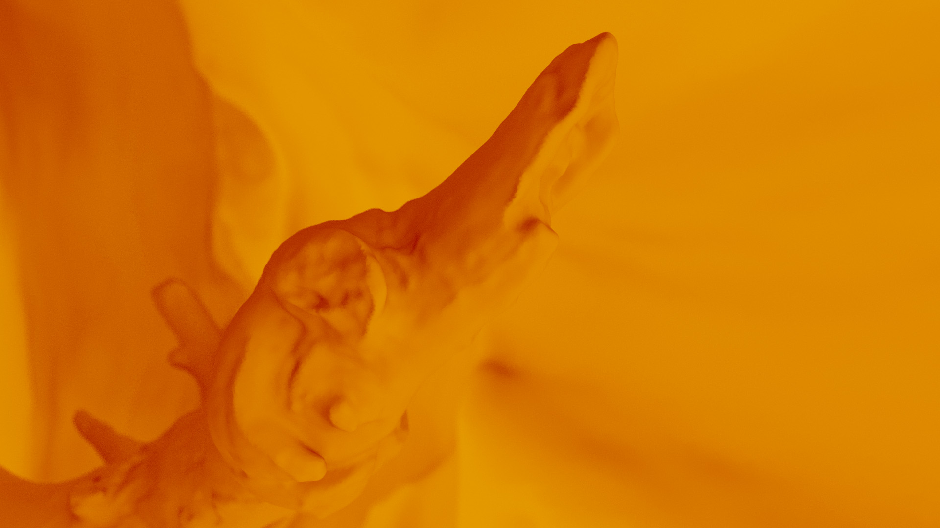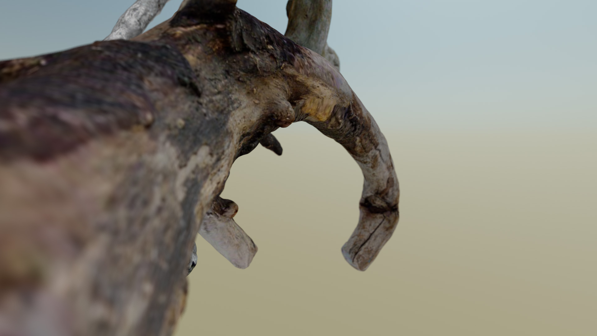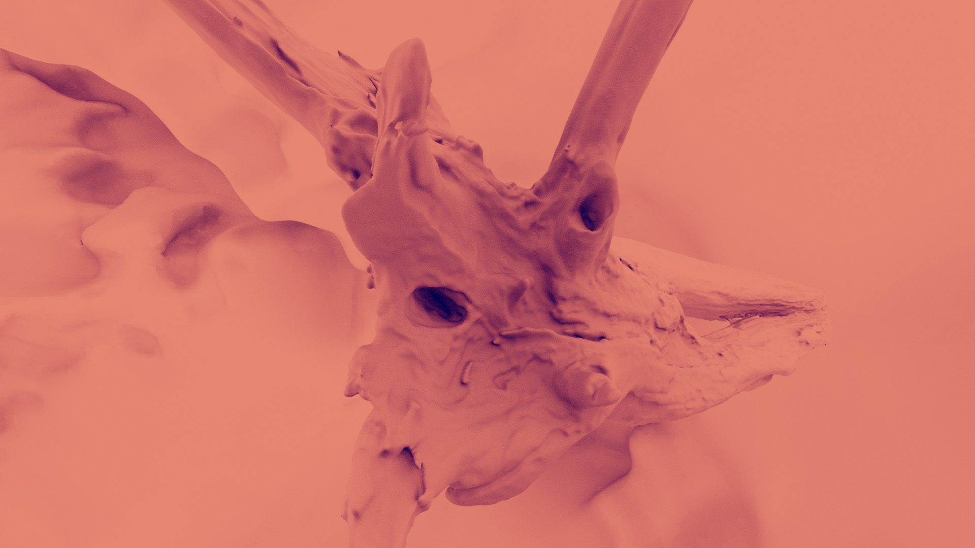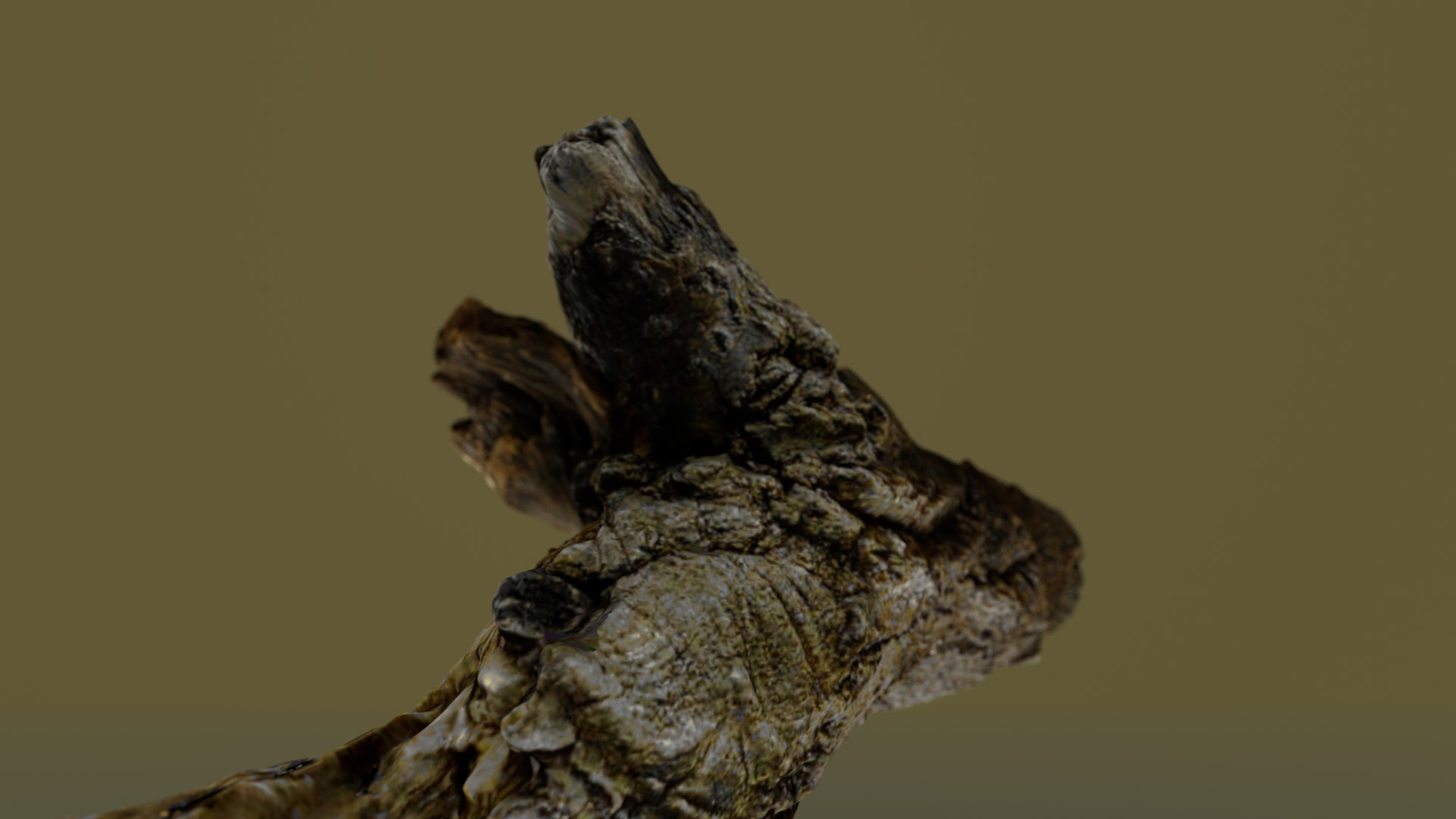 Paréidolies est réalisée au moyen de la photogrammétrie. Des branches de bois flotté récoltées sur la grèves du Saint-Laurent sont d’abord numérisées en 3D, puis filmées avant d’être subtilement animées dans de courtes vidéos où on se plait à dramatiser le phénomène psychologique de la paréidolie, soit la prédisposition de l’esprit humain à identifier des visages, des animaux ou autres figures familières que l’on croit percevoir dans les nuages, les rochers, ou en l’occurrence dans la morphologie du bois érodé et tordu. Un canal vidéo montre les branches filmées dans des coloris naturels, l’autre canal reprend les mêmes plans dans des couleurs totalement artificielles révélant d’autres aspects de la morphologie. Le tout dans un lent travelling laissant le visiteur suspendu à la découverte de nouvelles figures révélés par les angles changeants de notre point de vue sur ces objets.