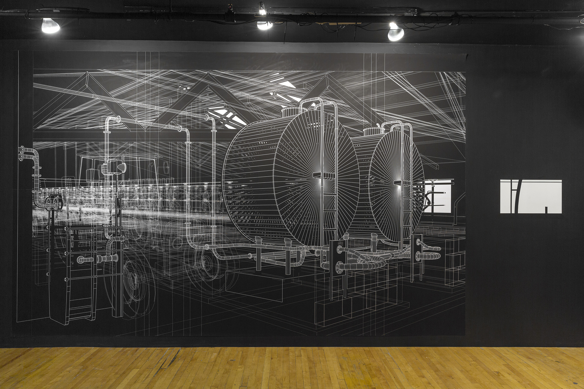 Retombée (Spin-Off) se définit en tant que dessin étendu vers la sculpture. L’œuvre hybride présente une grande image épousant une forme demi-cylindrique en équilibre précaire autour de laquelle gravite un réseau de tuyauterie, qui prolongeant le contenu de la grande image. L’ensemble parait partiellement enfoncé dans le sol. Ce dessin sculptural intitulé Retombée (spin-off) évoque les restes d’un dispositif industriel abandonné. Par sa volumétrie, l’œuvre s’inspire des installations pétrochimiques avec leurs combinaisons de tuyaux, de réservoirs, de valves, de pompes, etc. Les cathédrales modernes que sont ces usines sont fascinantes par leur complexité et leur gigantisme aux formes inédites qui défie l’entendement des simples citoyens, incapables d’en interpréter les véritables fonctions.