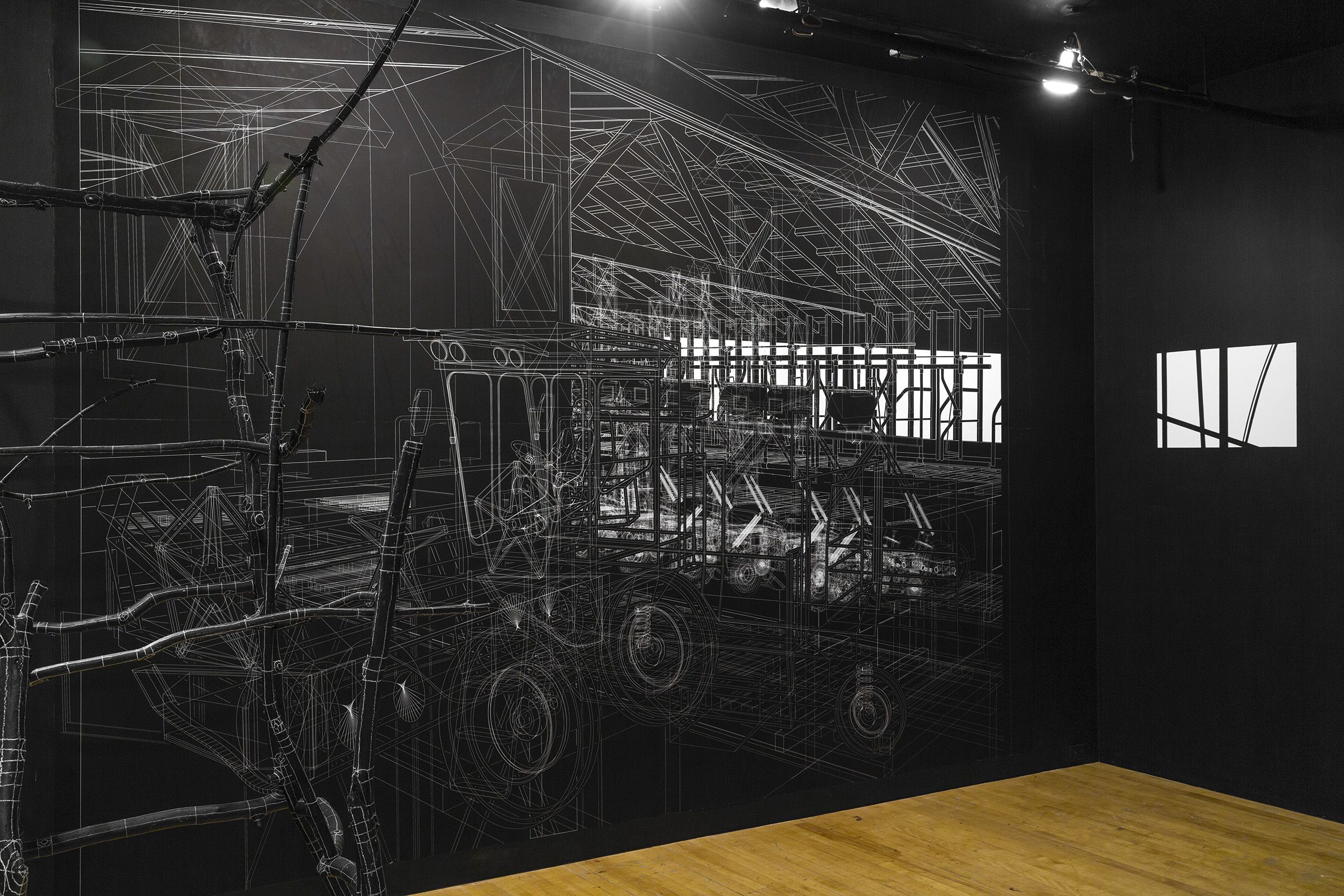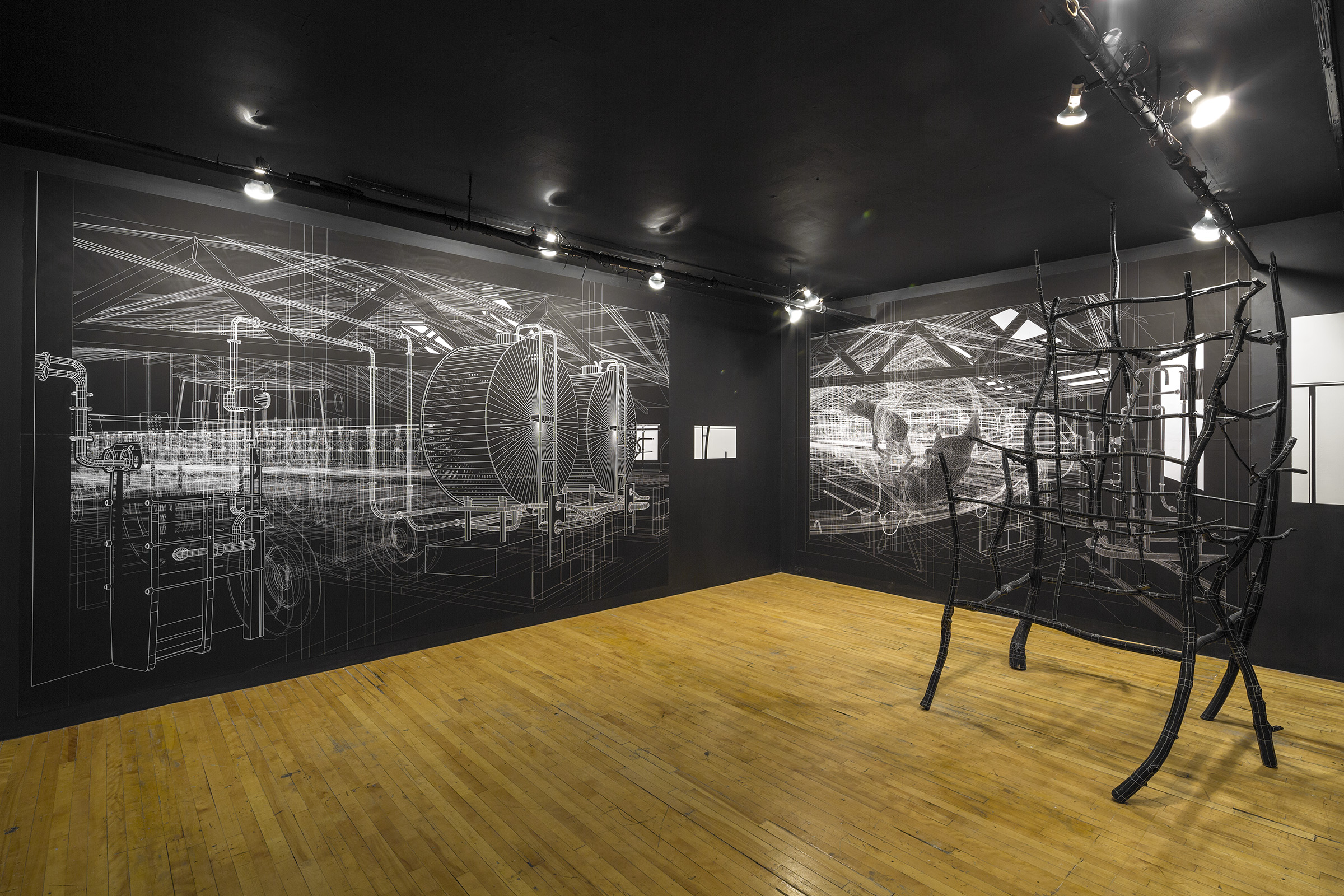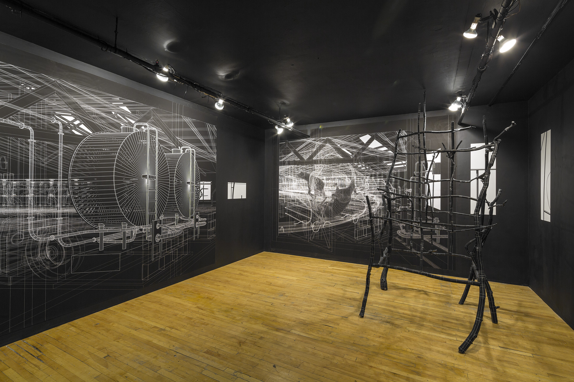 Vues de l’installation. Impressions numériques sur polypropylène, bois, peinture au latex marqueurs, crayon blanc.