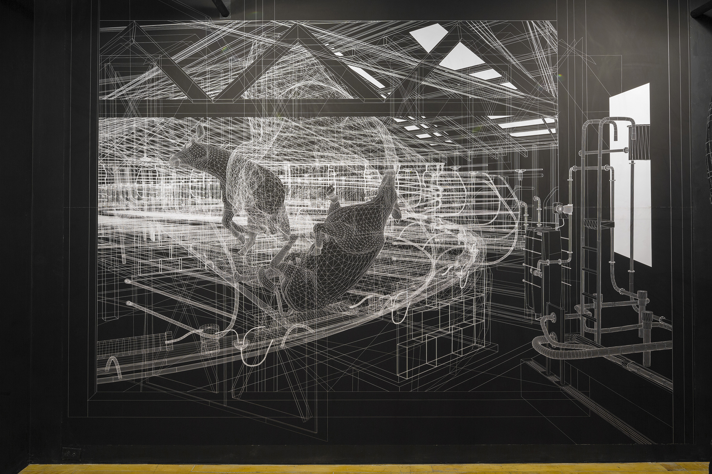 Les dessins vectoriels en fil de fer (wireframe) recouvrant toute la structure tendent à donner une inconsistance virtuelle à cette sculpture qui fait contraste avec la masse de l’objet. Par l’application de dessins vectoriels sur ses volumes, ce traitement graphique particulier à l’imagerie de synthèse cherche à nous ramener au moment initial de la conception d’un dispositif industriel, à son statut de projet. Un élan contraire à son état figuré de ruine.