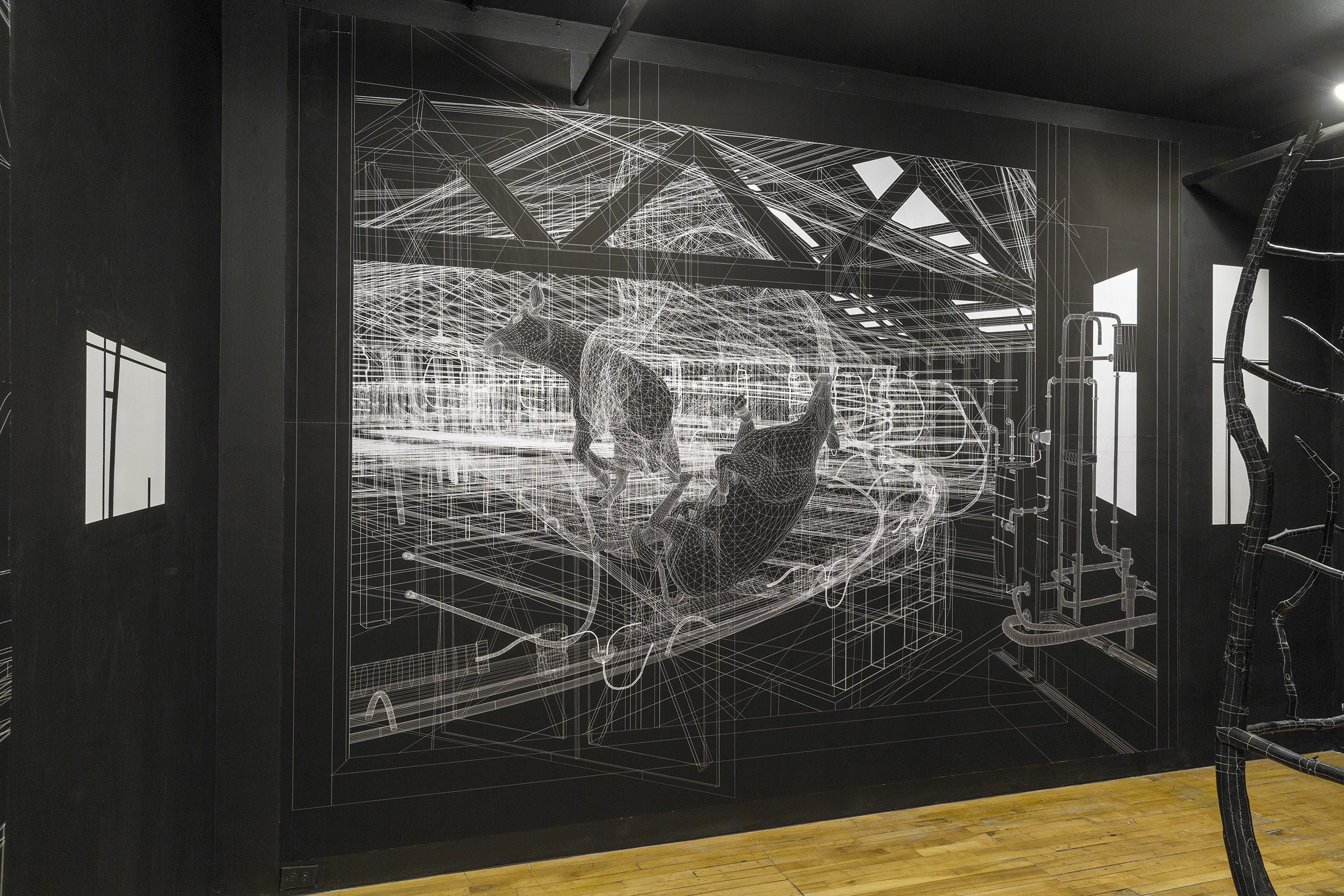 Sur les murs noirs de la salle, un réseau foisonnant de lignes vectorielles blanches tend à reconstituer, bien que très schématiquement, l’intérieur d’un bâtiment de ferme aux allures industrielles.