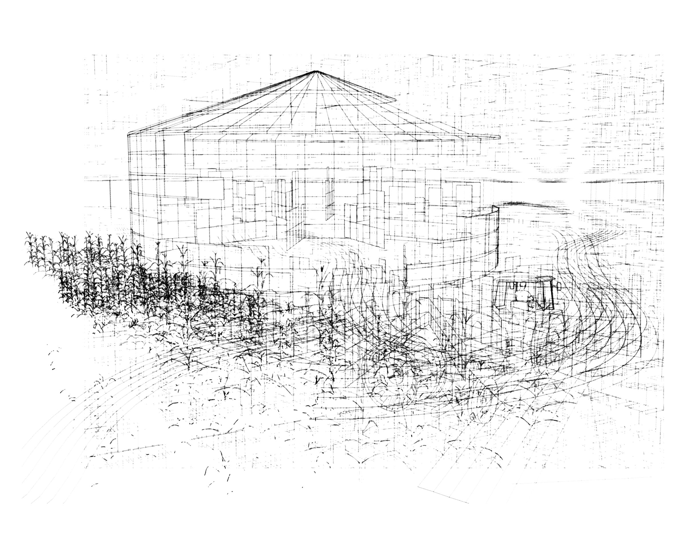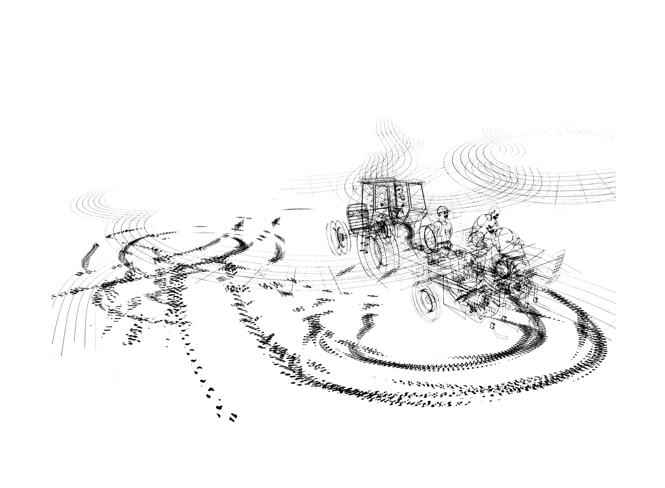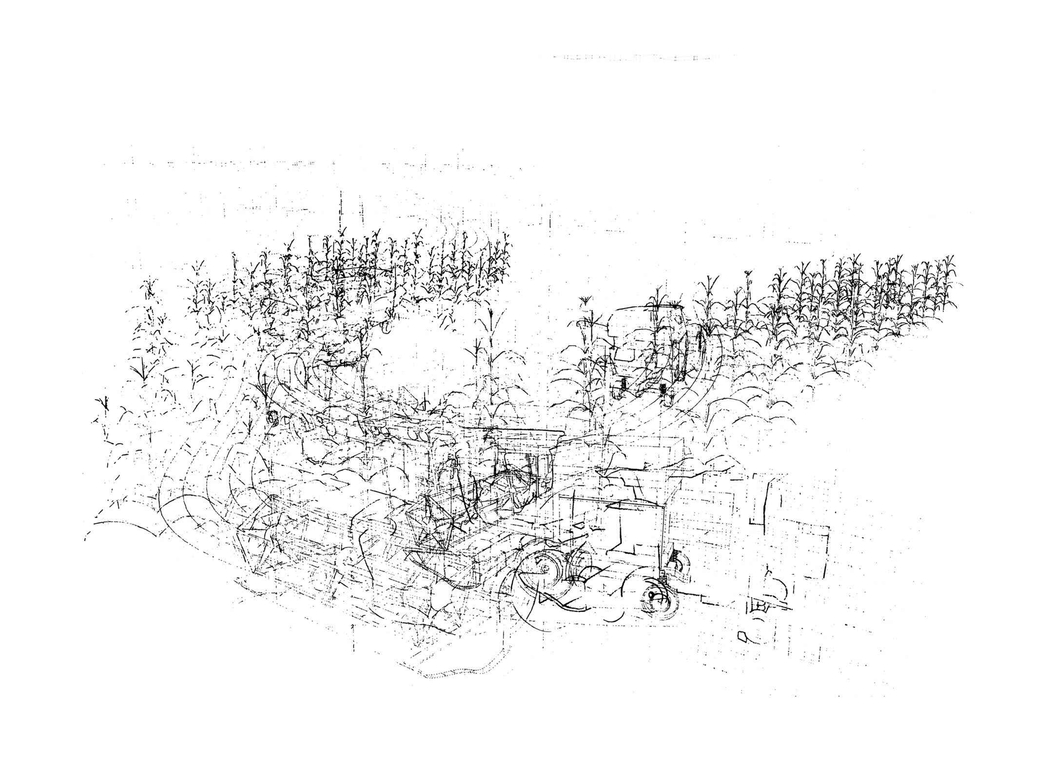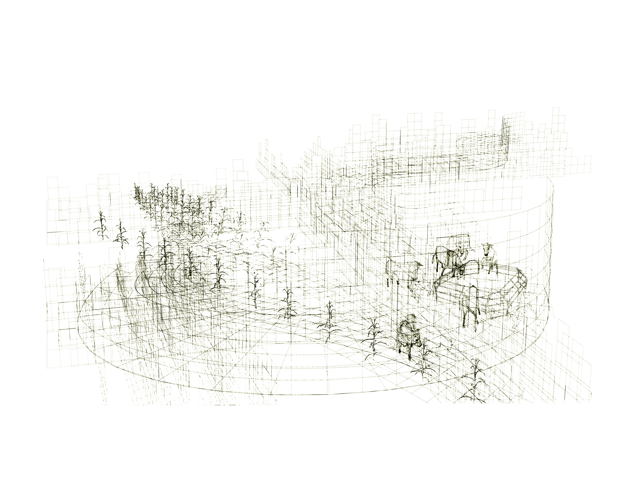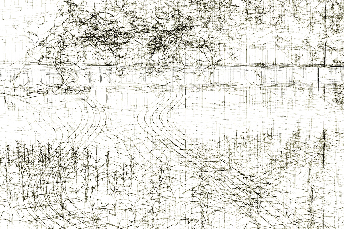 Ce projet fait l’objet de deux séries de dessins : l’une composée de lignes vectorielles numériques et l’autre réalisée avec des moyens traditionnels du dessin que sont le graphite, l’encre et l’aquarelle. Ces deux séries élaborées simultanément ont été l’occasion de revisiter le motif du paysage, insistant sur la ligne d’horizon, en installant de curieux croisements entre les lignes droites de plans en perspective et le foisonnement de nuées de figures issues du domaine agricole, telles que plans de maïs, vaches, machinerie.