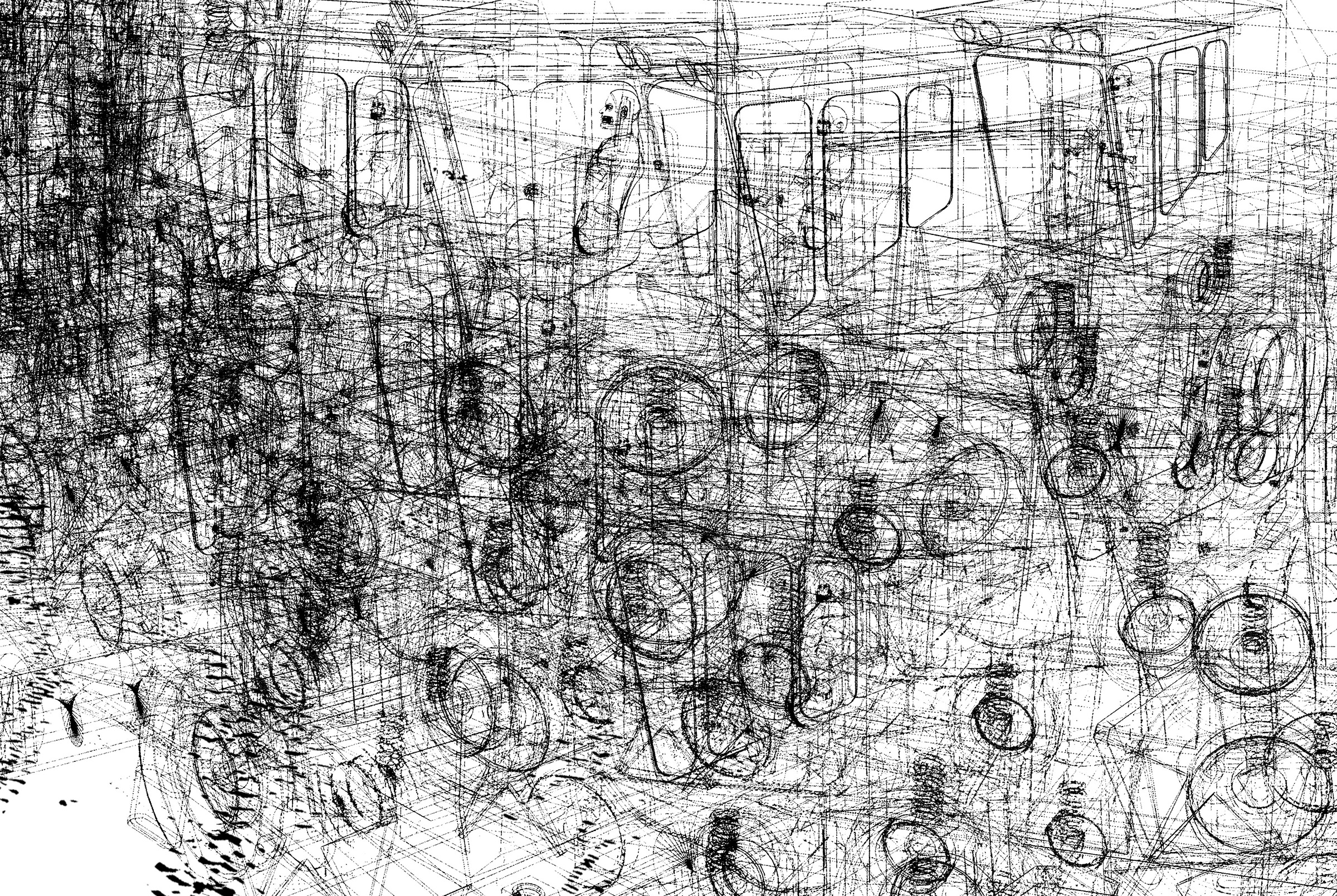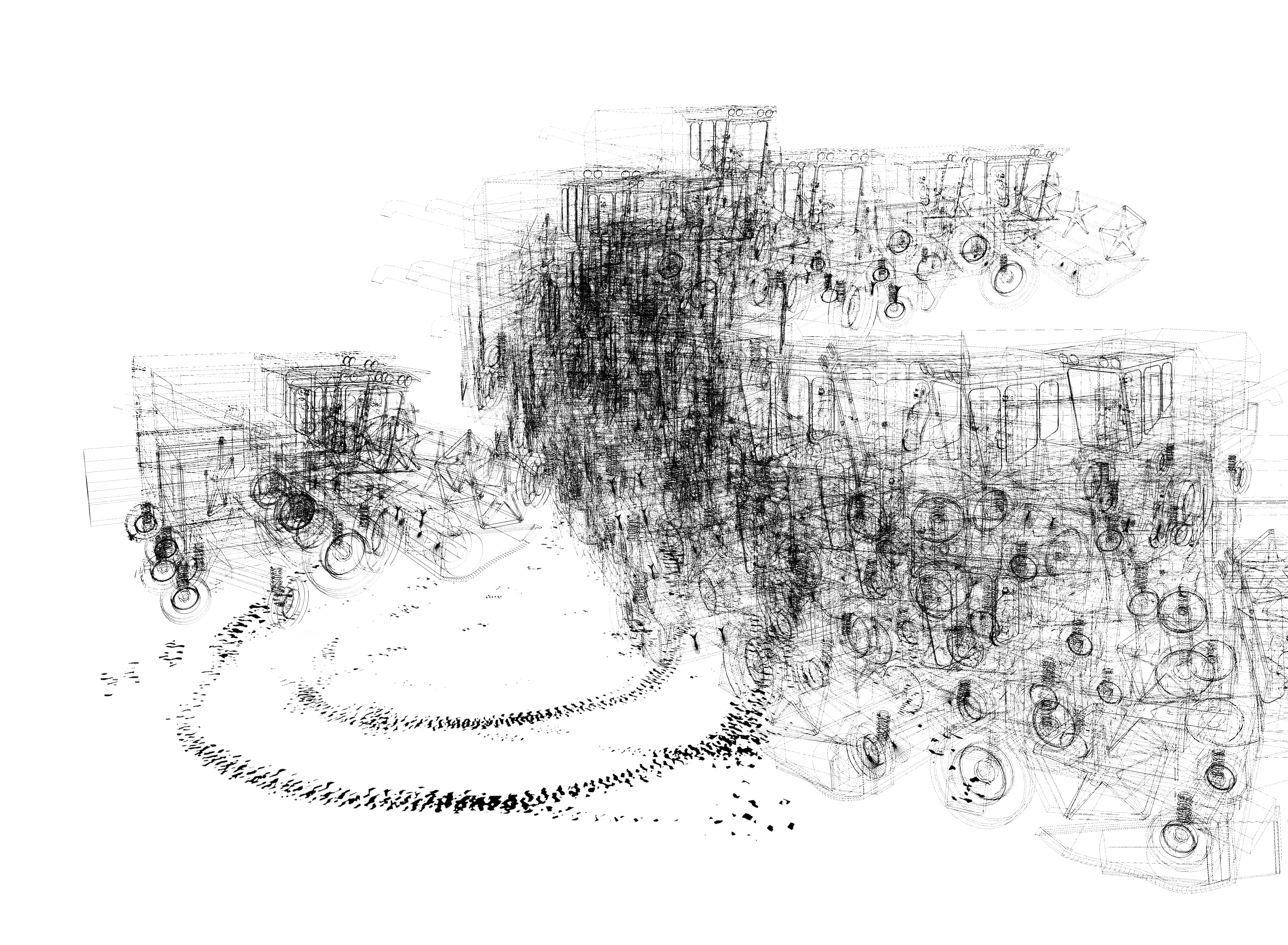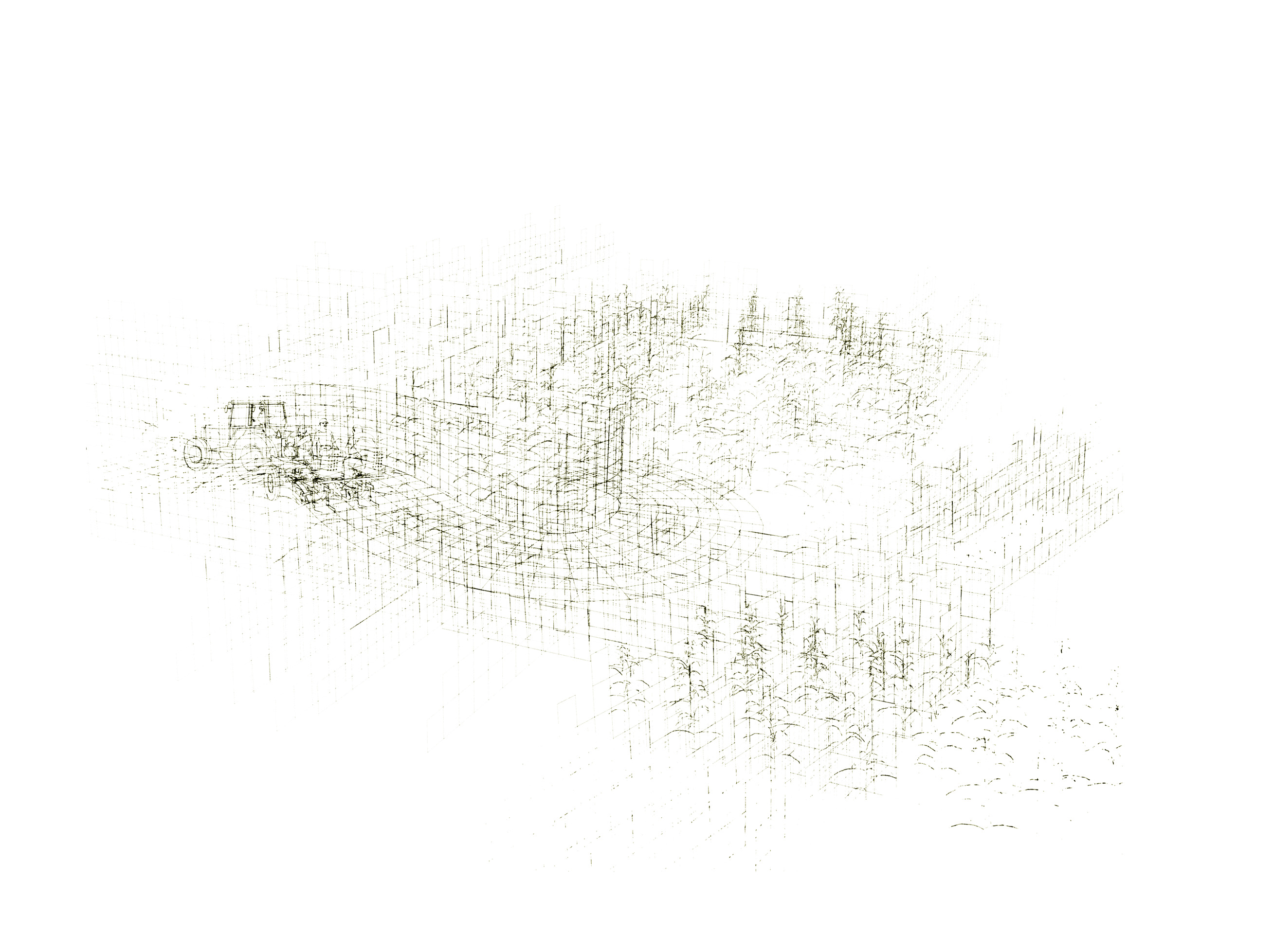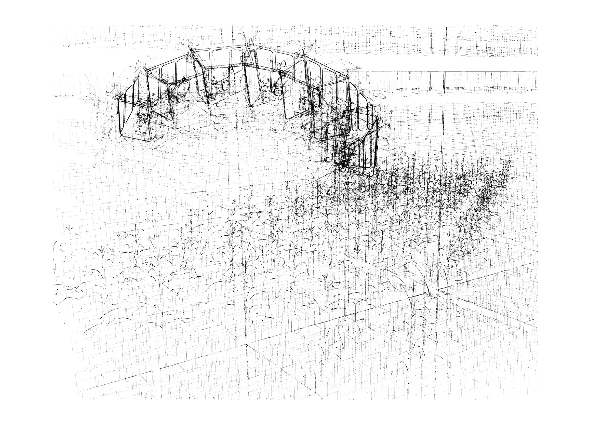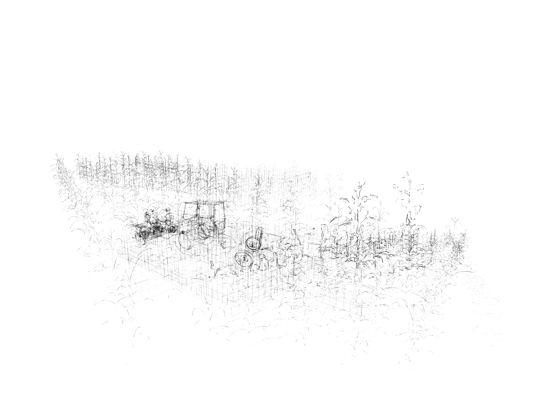 Ce projet fait l’objet de deux séries de dessins : l’une composée de lignes vectorielles numériques et l’autre réalisée avec des moyens traditionnels du dessin que sont le graphite, l’encre et l’aquarelle. Ces deux séries élaborées simultanément ont été l’occasion de revisiter le motif du paysage, insistant sur la ligne d’horizon, en installant de curieux croisements entre les lignes droites de plans en perspective et le foisonnement de nuées de figures issues du domaine agricole, telles que plans de maïs, vaches, machinerie.