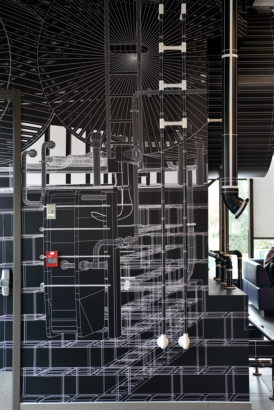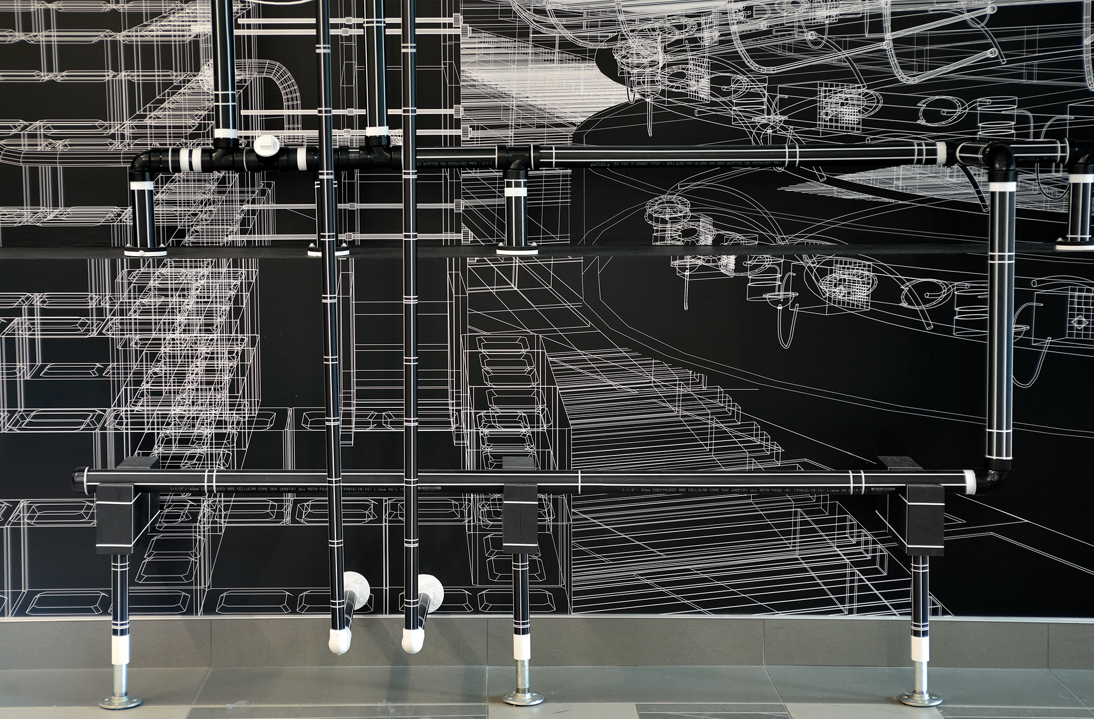 Volume attendu est une œuvre immersive réalisée dans le contexte de la triennale Orange 2019, Conjuguer la traçabilité. Ce dessin monumental créé sur mesure se déploie sur quatre murs de la Verrière du CÉGEP de Saint-Hyacinthe, propulsé dans l’espace à travers une excroissance du réseau de plomberie de l’édifice jusque dans les infrastructures du plafond. Ce dessin vectoriel, formé d’un foisonnement de volumes transparents déploie l’image d’un gigantesque robot de traite comme on en équipe de plus en plus les étables laitières contemporaines.