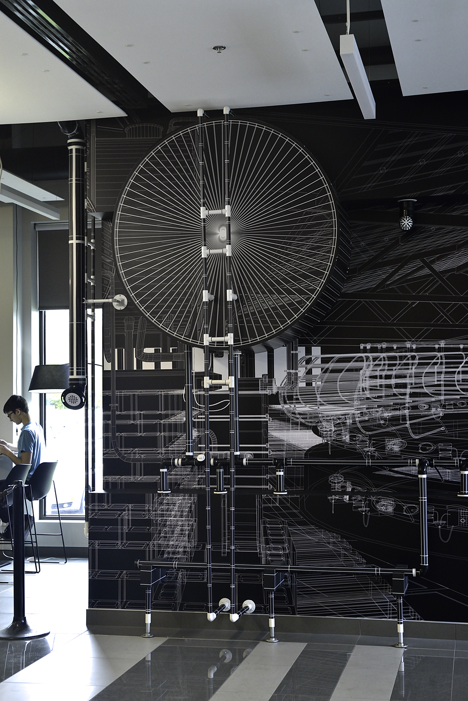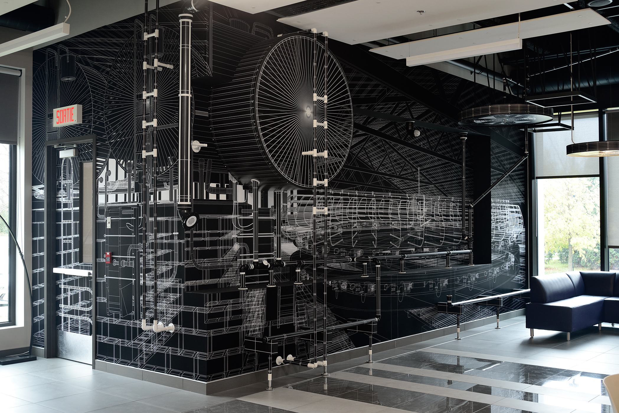 Témoin des mutations accélérées du domaine agricole, l’auteur prend le parti de laisser toute la place à la machine, sans y adjoindre la présence d’animaux, décrivant plutôt ses volumes complexes avec force détails, révélant une forme intrigante, voire abstraite, loin de ce qu’on imagine pour un lieu destiné à la culture du vivant.
